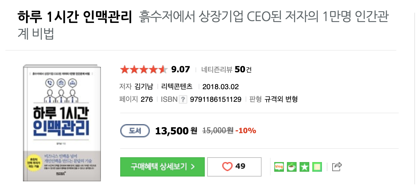 위의 책이다. 뭐 책을 홍보하려는 생각도 없고, 인맥관리라고 네이버에 검색만 해보면 이 책이 가장 상위에 링크되어 나온다. 아무튼 흙수저에서 인맥관리만을 통해서 상장기업 CEO가 되신 김기남님께서 쓰신 책인데, 관리하는 인맥만 3000명에 육박하신다고 하신다. ㅎㄷㄷ...