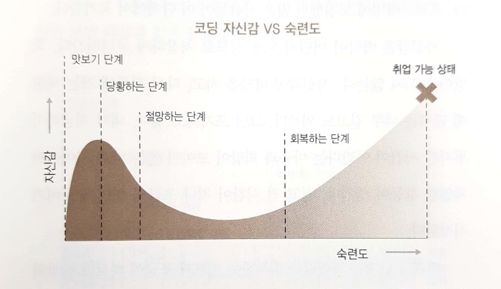 나는 이 책을 읽으면서 정말 이 그래프가 너무 잘 맞다고 생각했는데, 나도 사실 프로그래밍이라는 것을 처음 시작 했을 때 내가 코딩을 잘 한다고 잠시 착각을 하였었다... 그리고 혼자 공부를 본격적으로 시작하면서 곧 당황하는 단계를 맞이하였고, 절망하였다.