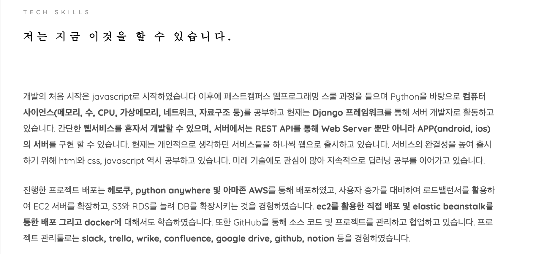 그리고 앞 부분에는 내가 개발을 시작한 이유와, 내가 현재 개발자로서 어떤 일을 할 수 있는지 상세히 적었다.