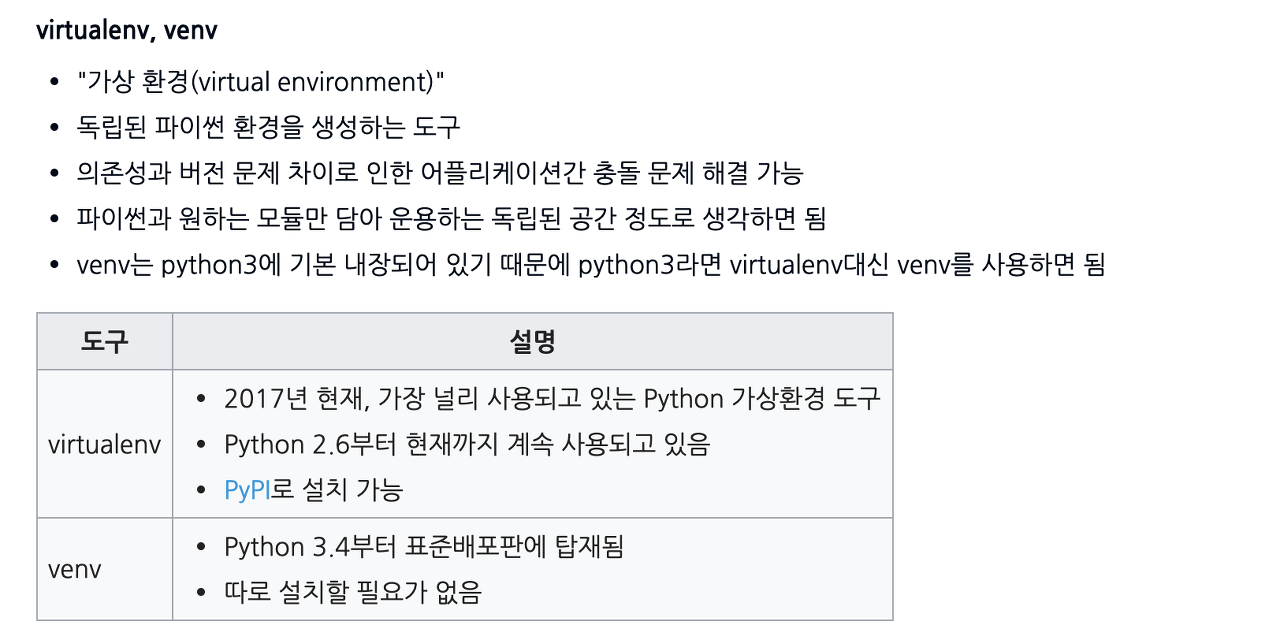 - venv : 파이썬3.4부터 기본적으로 탑재