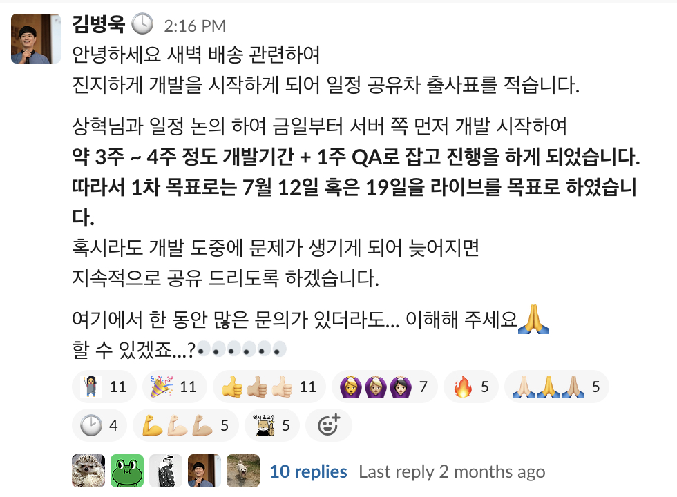 그렇게 출사표를 던졌다.(이때까지만 하더라도 거이 새벽배송은 서버 쪽만 건들면 되는 거 아닌가 라는 내부적인 생각도 있었다. 우리 TF팀조차도..)