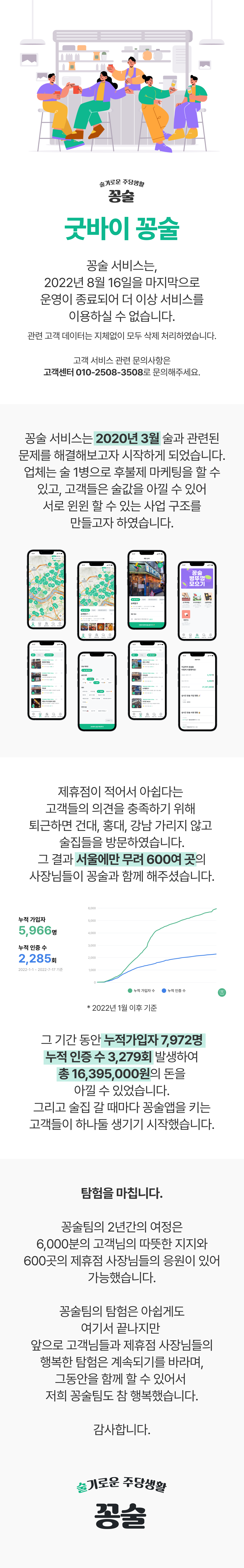 결론적으로는 그 많은 영업사원분들 중 한 분이 남아서, 꽁술 제휴점의 대부분을 영업하셨다. 그렇게 매달 꽁술 제휴점은 100곳 이상씩 늘어났지만, 코로나 단계도 계속 높아져갔다. 오픈한지 3개월이 지난 6월이 되자 더 이상 코로나로 인해 술을 마시기도 어려워졌다. 2명까지, 9시 제한은 술을 먹지 말라는 말과 같았다.