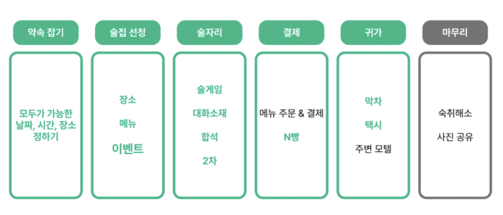 술자리를 가지는 전 과정을 돌아보면 약속잡기 => 술집 선정 => 술자리 => 결제 => 귀가 => 마무리(숙취해소) 이렇게 볼 수 있었고 이 전 과정에서 문제들을 어떻게든 뽑아내었다.