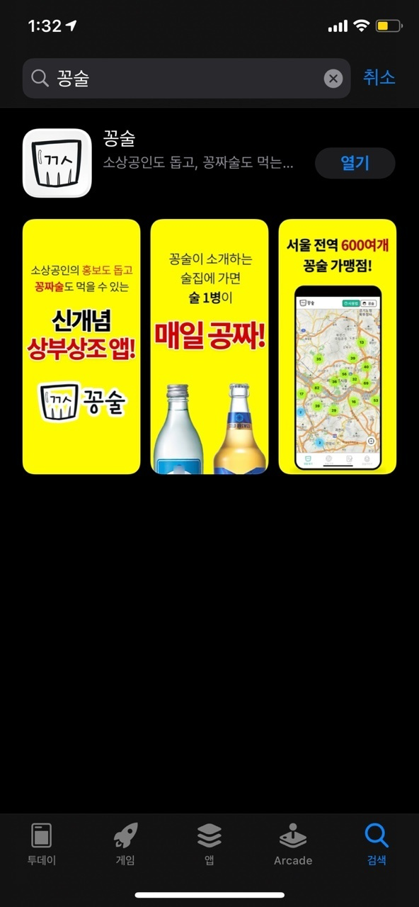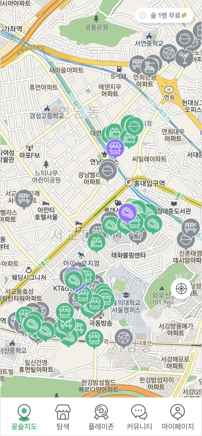 앱을 다운 받기만 하면, 서울 600여개 제휴점에서 술 1병씩 공짜로 먹을 수 있는 서비스.