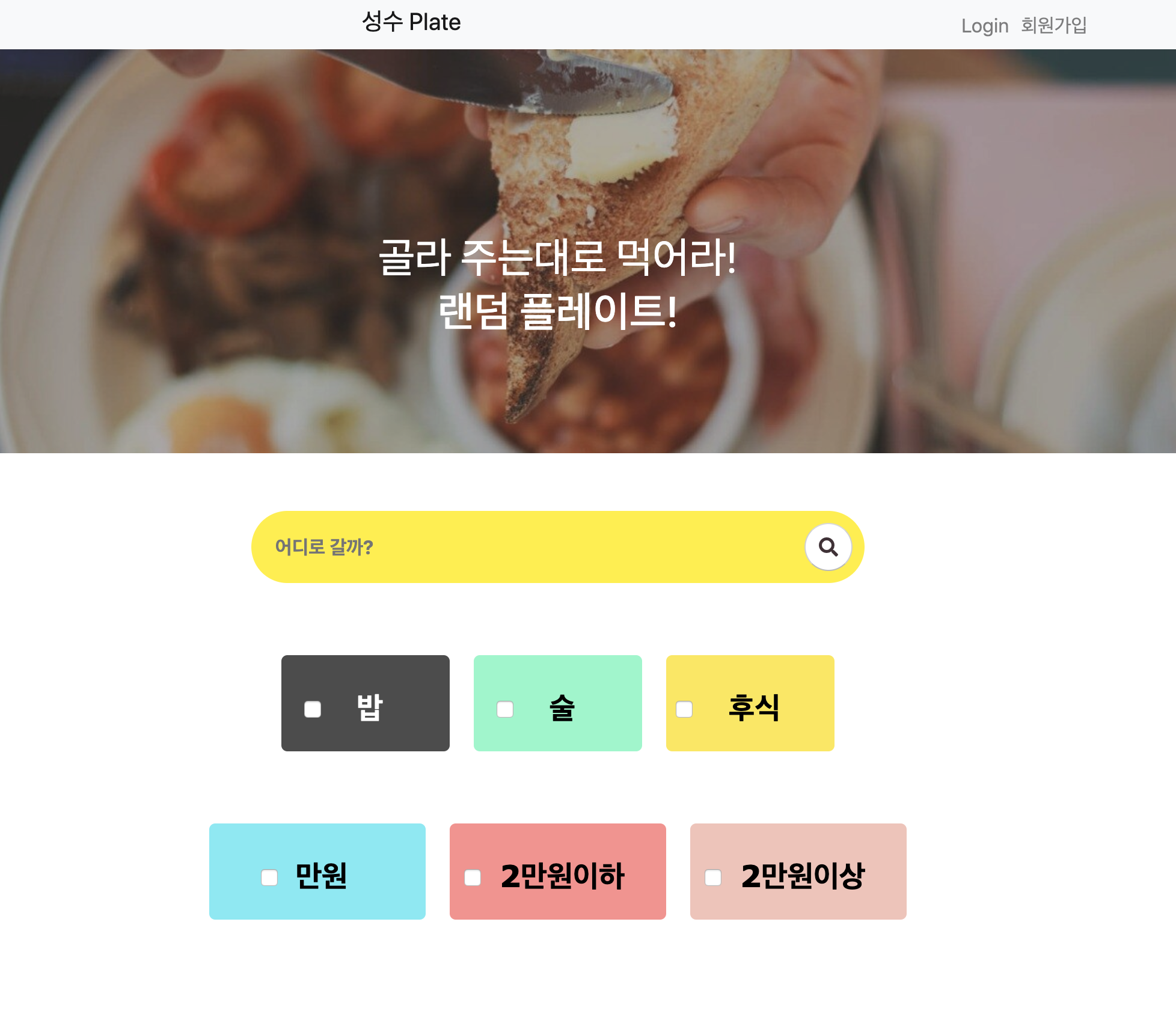 어디를 갈 것인지 넣을 수 있고, 아래에서 밥, 술, 후식 중 하나의 카테고리를 선택하고 그 아래에 가격대에 맞추어 한번 더 선택할 수 있는 카테고리가 있다.