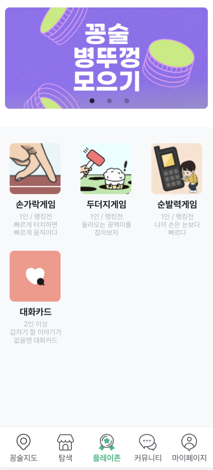 그렇게 꽁술 앱에는 다앙한 키워드(분위기 좋은, 화장실이 깔끔한, 가성비, 데이트, 헌팅포차 등등)로 필터하여 술집들을 찾을 수 있는 큐레이션 기능이 추가되었고, 다양한 게임들, 그리고 신규 이벤트들이 하나씩 추가되었다.