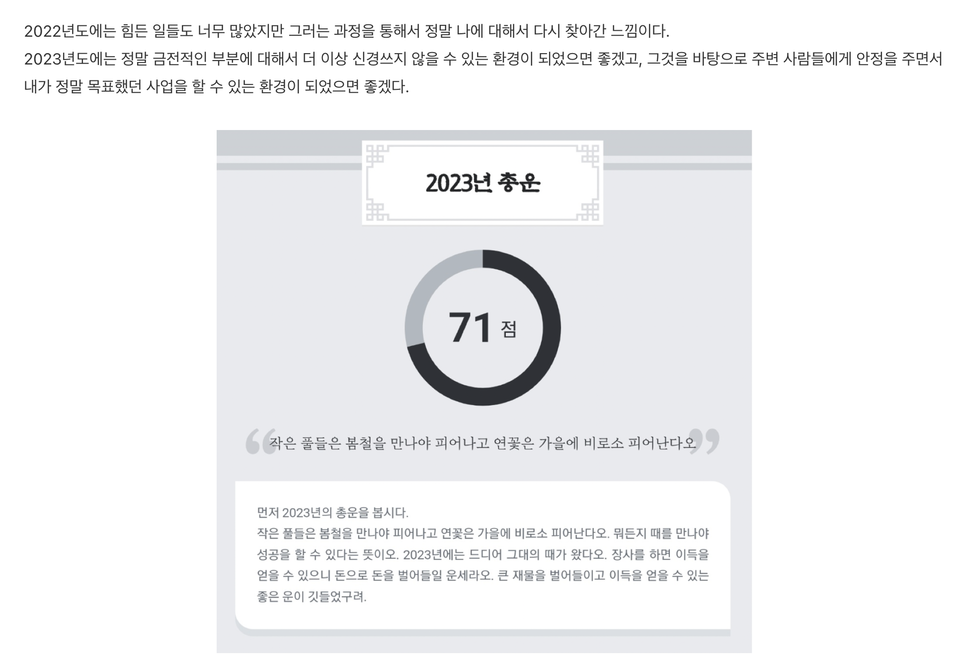 "2023년도에는 정말 금전적인 부분에 대해 더 이상 신경쓰지 않을 수 있는 환경이 되었으면 좋겠고, 그것을 바탕으로 주변 사람들에게 안정을 주면서 내가 정말 목표했던 사업을 할 수 있는 환경이 되었으면 좋겠다"
